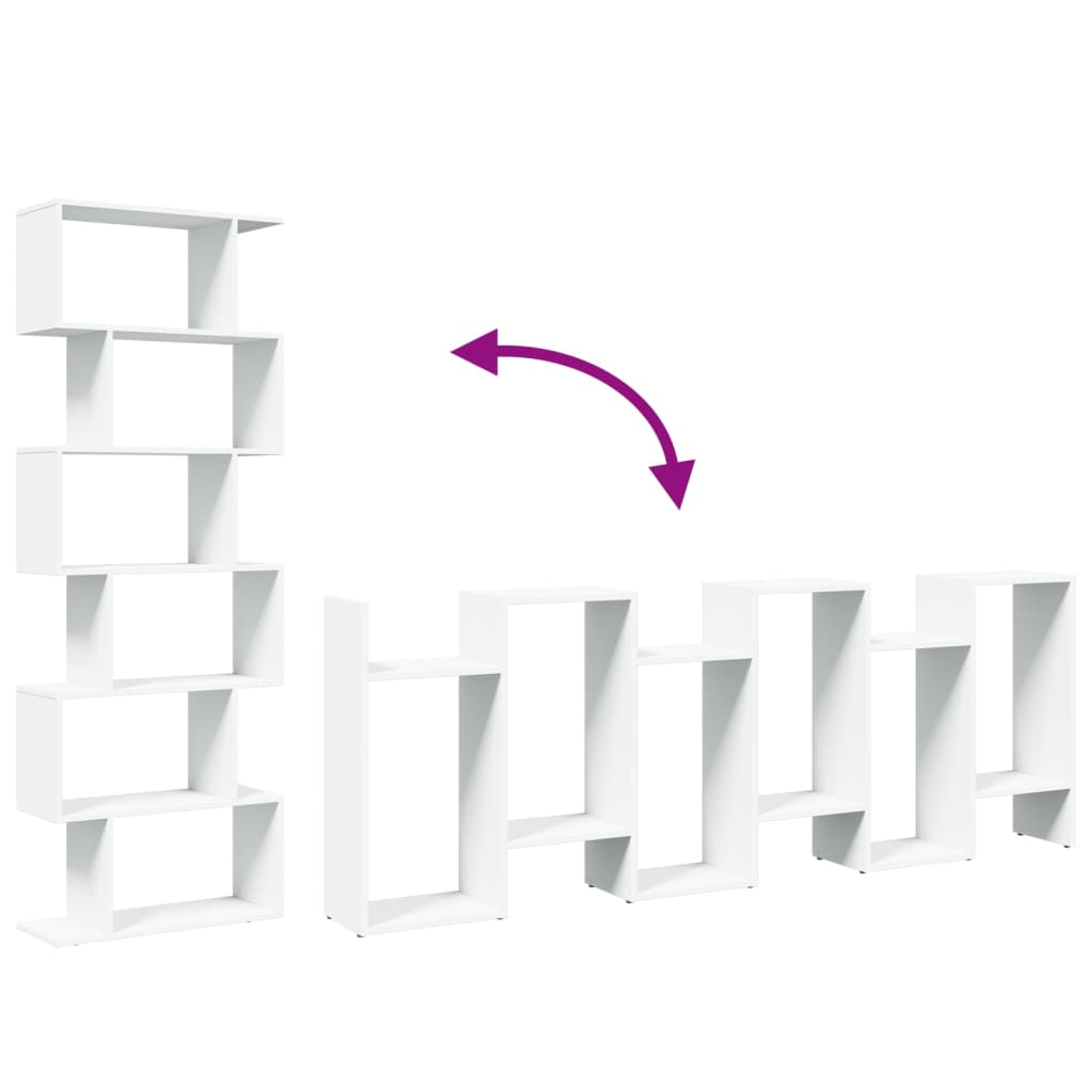 The room divider bookcase blends a geometric shape design with storage, perfect for organizing your space with style! Stable and durable material: Engineered wood is a durable and stable material with a smooth surface that is resistant to moisture, warping, and splitting, making it a reliable choice for various projects.Ample storage: The bookshelf features staggered storage compartments, offering ample space for your books or decorations. You can also choose to display smaller items on the edge platforms, making optimal use of space while keeping your belongings neatly organised.Flexible placement options: The storage shelf can be positioned with either its width or height on the ground, offering different room layout options.Versatile applications: The bookshelf can also be used as a room divider, easily fitting into any style of room. You can place it in the living room to display decoration, in the study to store books and documents, in the bedroom to store everyday items, and in the basement to store bits and bobs.Easy maintenance: Thanks to its smooth surface, the storage bookshelf is easy to clean with a damp cloth and requires less maintenance. Warning:To prevent it from tipping over, this product must be used with the provided wall attachment device. Good to know:Screws and plugs for inside the wall are not included. We advise to find and use screws and plugs suitable specifically for your walls. If you're not sure, you can consult with a professional. Please read and follow each step of the instructions.