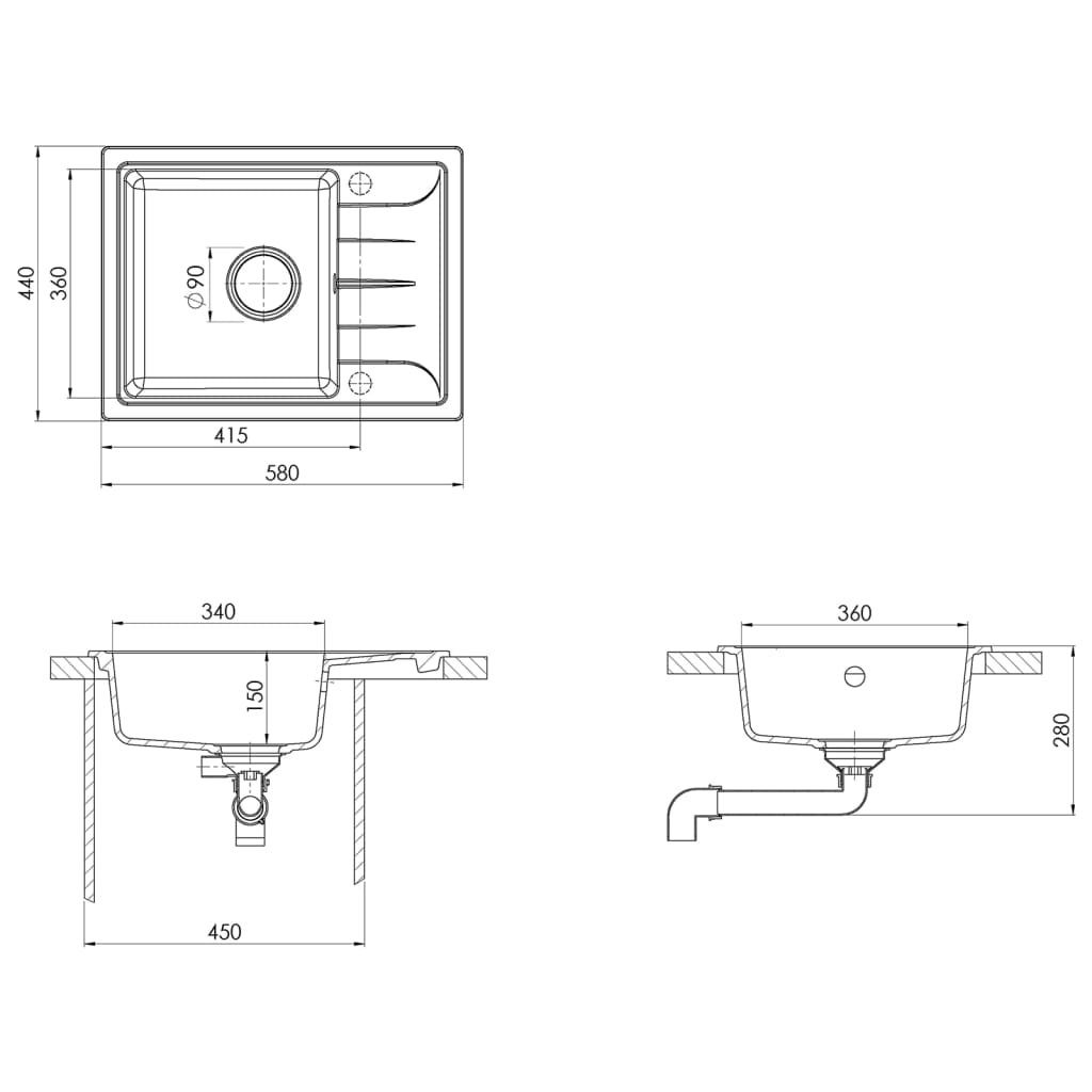 - Basin dimensions: 340 x 360 x 150 mm (W x D x H)