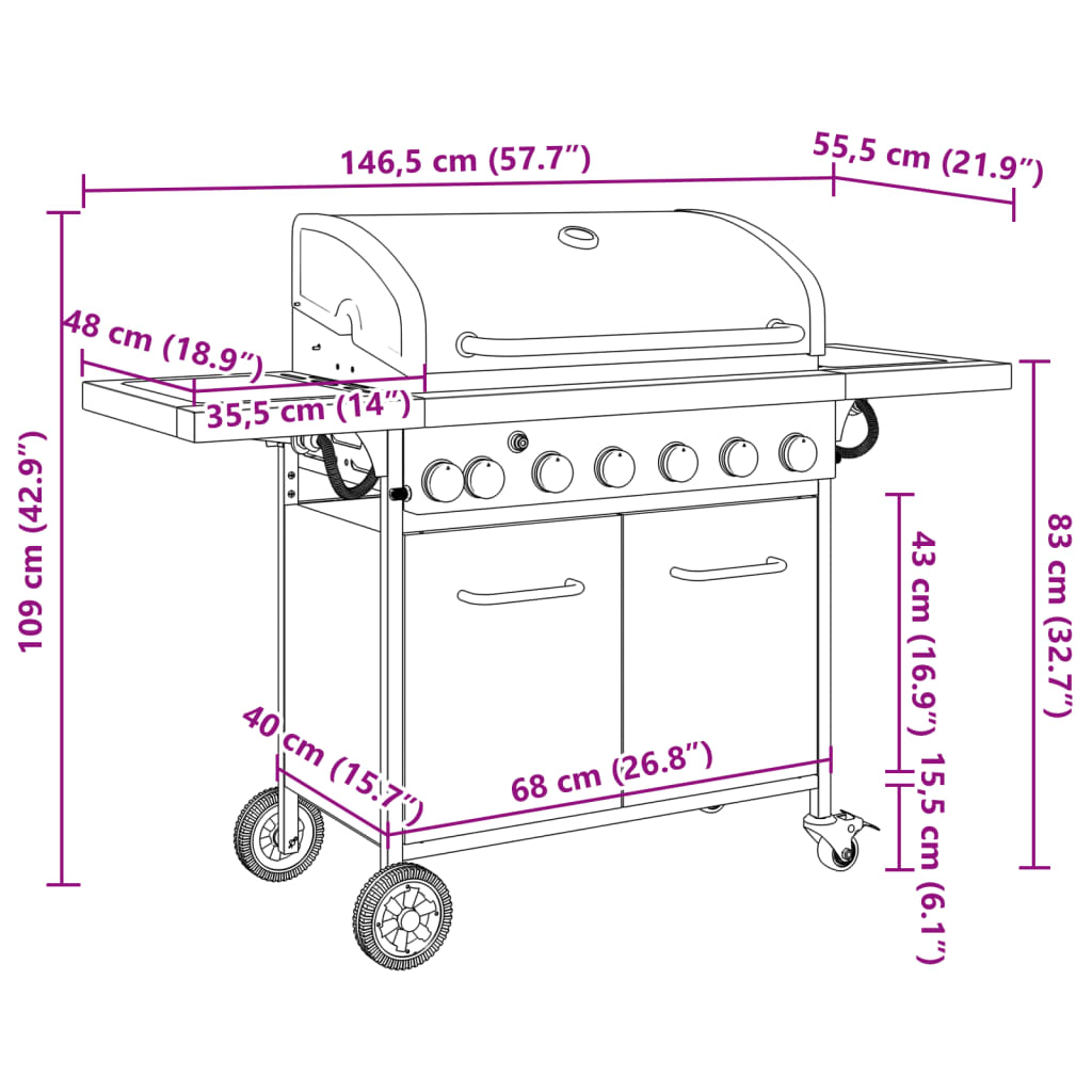 This gas bbq grill, equipped with 7 burners, will be a perfect choice for treating your family and friends to a pleasant barbecue. Stable and long-lasting frame: Steel is strong, stable, and durable, making it an ideal choice for a wide range of applications, from furniture manufacturing to construction.Ample cooking space: The outdoor grill has a large cooking surface, and the side burner offers additional workspace for making sauces or your favourite side dishes.Convenient design: Thanks to the flexible wheels, the gas barbecue is easy to transport and move around. You can enjoy the barbecue time wherever you want.Extra storage: The cabinet underneath the gas grill provides ample space to store kitchen supplies or BBQ tools.Piezo ignition: The piezo ignition system provides fast and reliable burner start-ups with the push of a button.Build-in thermometer: An accurate built-in thermometer on the cover of the bbq grill is especially helpful, making the family food well-done at all time. Good to know:To connect the barbecue to the gas cylinder, a gas hose and a proper pressure regulator are required, which are not included in delivery. Warning:The BBQ grill will become very hot during use. Do not move it during operation.Never place gas cylinders in the storage cabinet or under the BBQ.