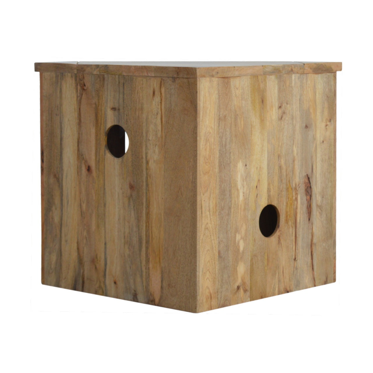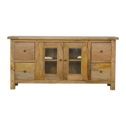 This beautiful corner media unit is constructed from 100% mango wood in a fine hand-distressed oak-ish finish along with 2 shiny knobs, to give it that country charm style. It has 2 glazed doors with a shelf placed inside, to display things such as ornaments and pictures, etc. Height : 65cm, Width : 90cm, Depth : 58cm, Carton Height : 75cm, Carton Width : 100cm, Carton Deapth : 68cm,