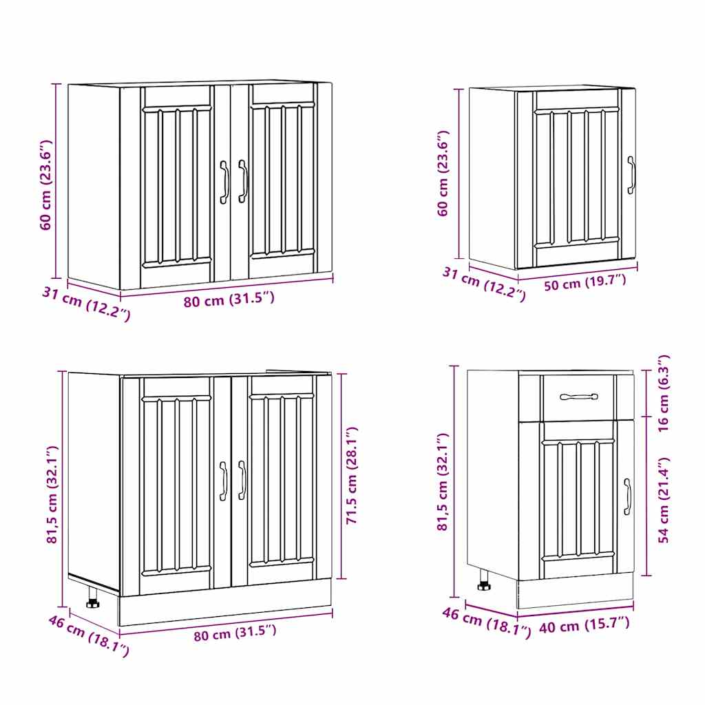 This 7-piece kitchen cabinet set, with its elegant design, optimises your kitchen space and provides ample storage space for your personal belongings! Stable and durable material: Engineered wood is a durable and stable material with a smooth surface that is resistant to moisture, warping, and splitting, making it a reliable choice for a variety of projects.Ample storage space: The kitchen cabinet set has many compartments, and offers sufficient space to store bowls, plates, pots, and other kitchen appliances.Adjustable feet: The bottom cabinets feature adjustable feet that can be adjusted in height to suit your kitchen layout.Easy to maintain: Thanks to its smooth surface, these kitchen cabinets are easy to clean with a damp cloth and require less maintenance. Warning:This product must be secured by installing a worktop. Good to know:Screw(s) and plug(s) for inside the wall are not included. Seek and use screw(s) and plug(s) suitable for your walls. If you are uncertain, seek professional advice. Read and follow each step of the instruction carefully.The worktop, sink and faucet are not included in the delivery.
