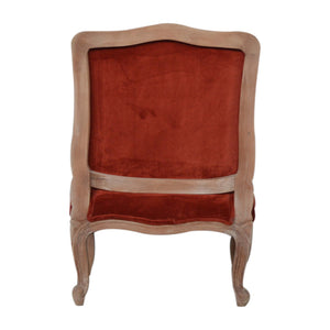 This elegant chair has been upholstered in a Brick red cotton velvet fabric. It features carved French style cabriole legs constructed from 100% solid mango wood in a sunbleach finish providing strength and durability. This simple yet classy piece can be incorporated in different home settings and interiors. Height : 94cm, Width : 66cm, Depth : 60cm, Carton Height : 104cm, Carton Width : 76cm, Carton Deapth : 70cm,