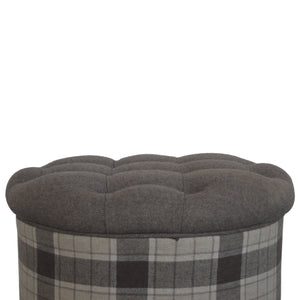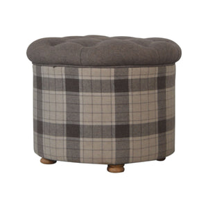 This little round stool with oak-ish feet has been upholstered in brown tartan fabric with a brown tweed top featuring a deep button design and can be used as an occasional seat in any setting. You may encounter variations from batch to batch hence if you are looking to pair products under similar room settings; you can opt for a bespoke order or take an informed decision about the possible variations. Height : 45cm, Width : 58cm, Depth : 58cm, Carton Height : 50cm, Carton Width : 63cm, Carton Deapth : 63cm,