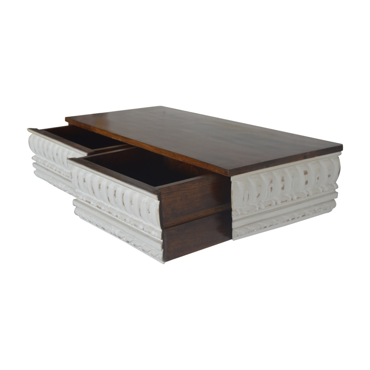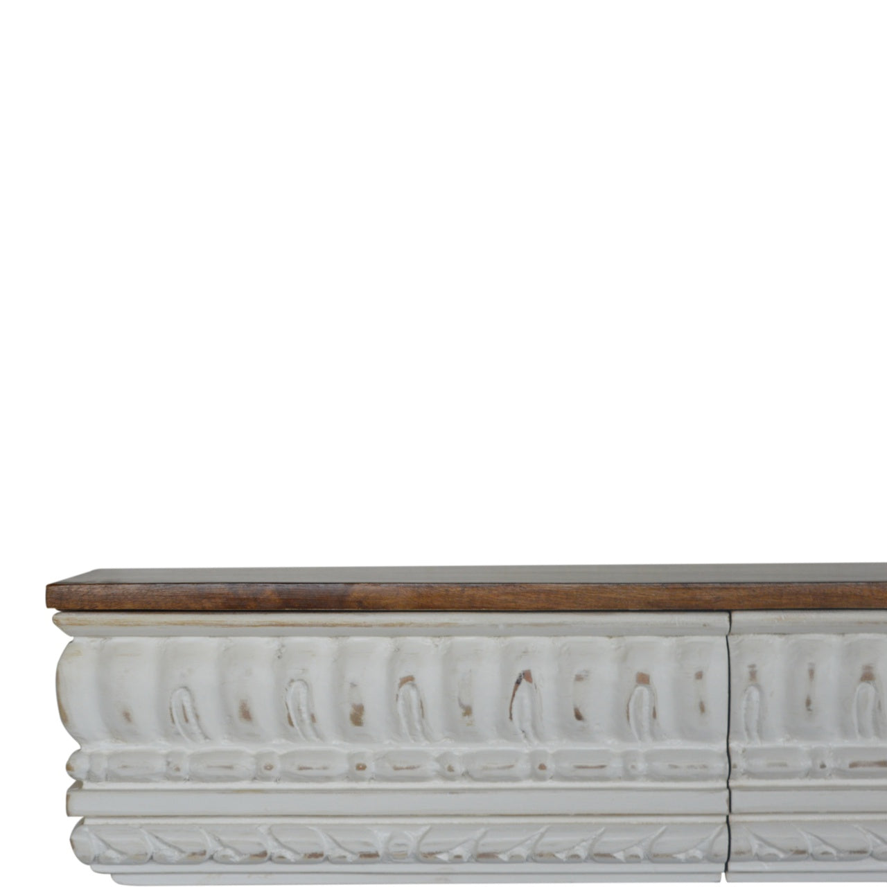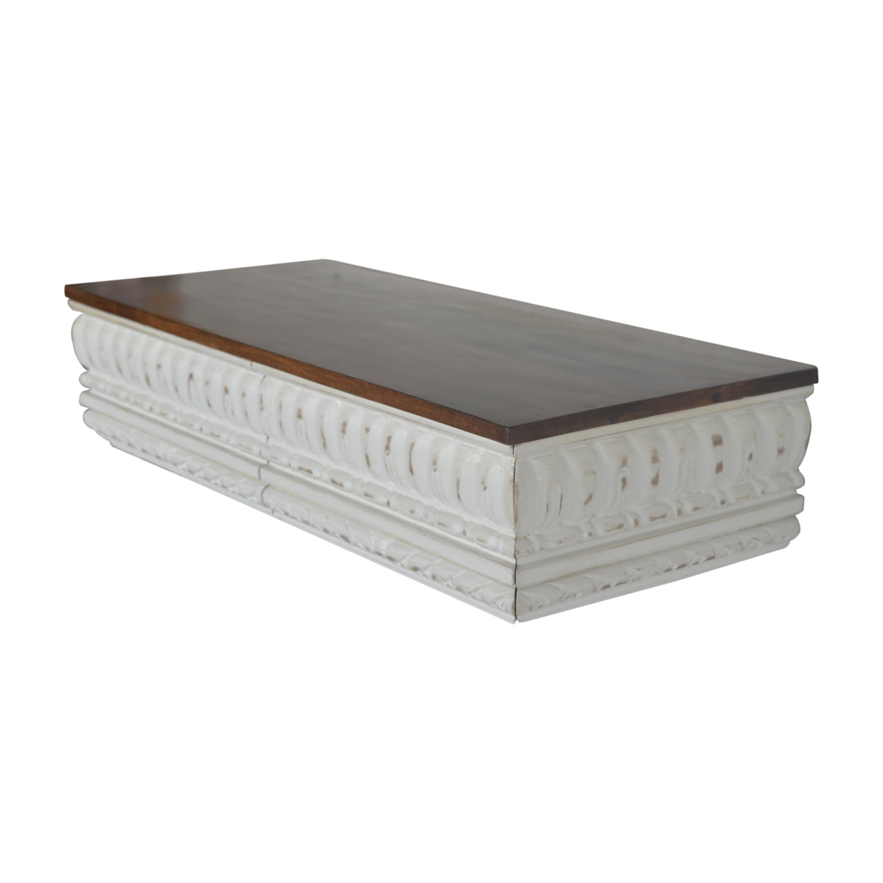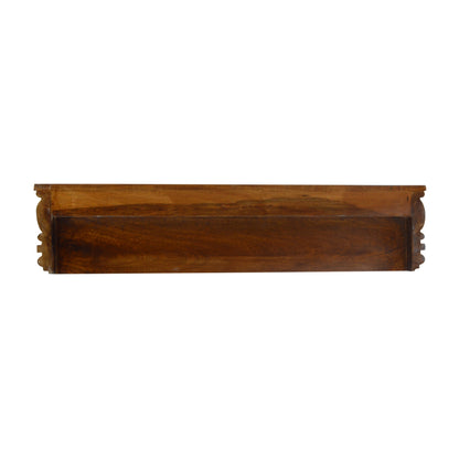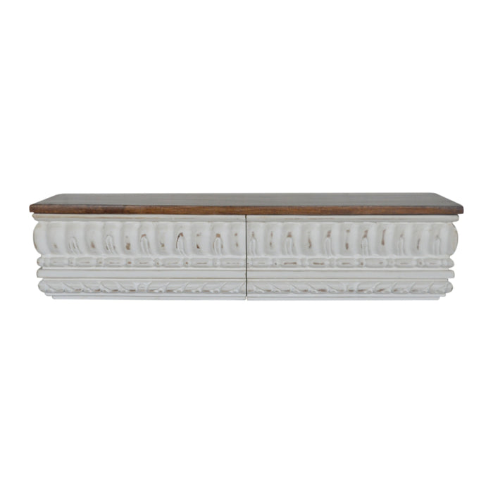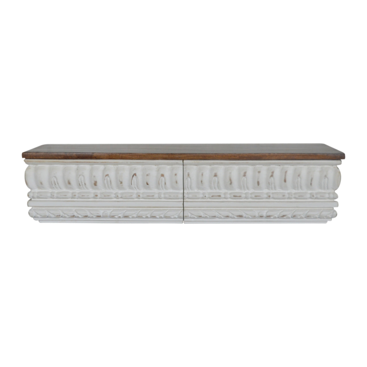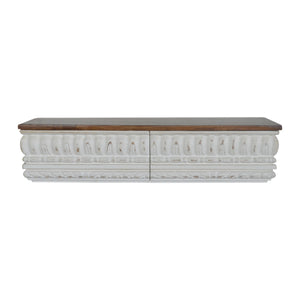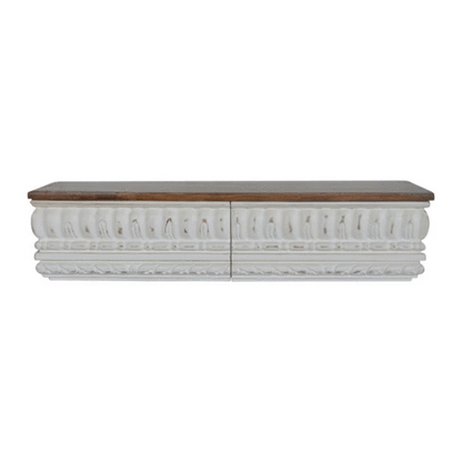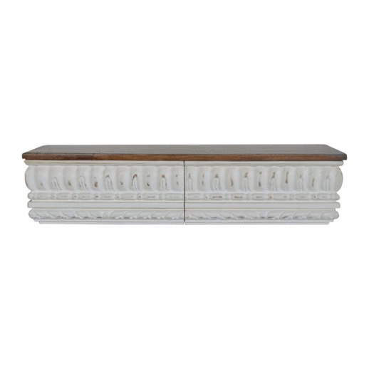 Introducing the LLB range. With all the easygoing elegance of timeless Italian Style, Palazzo is a uniquely embellished collection of wall-hung storage solutions, celebrating the superbly fancy effect only hand-assisted carving can create. This media unit has been constructed from 100% solid mango wood and finished in a pale acid wash finish with a rich honey wooden top and features a concealed pull handle for easy access into the drawer. The wall-mounted design is perfect for anyone with limited storage options. Height : 18cm, Width : 80cm, Depth : 35cm, Carton Height : 28cm, Carton Width : 90cm, Carton Deapth : 45cm,
