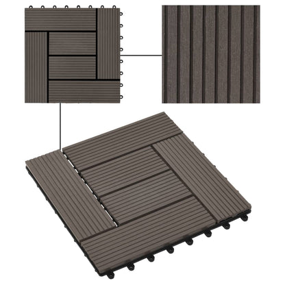 This WPC decking tile set, with an individual tile size of 30 x 30 cm, consists of 22 pieces and covers a total surface area of 2 square metres. It will be perfect for patios, balconies, bathrooms, or your pool or spa area. These quality WPC tiles feature a quick connect interlocking system, allowing you to easily and quickly install them without the need for tools. Made of quality wood plastic composite, our tiles are water-resistant and highly durable.