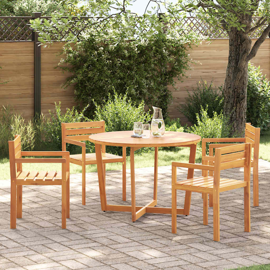 Enjoy a nice meal outdoors with your family and friends with this wooden garden dining set! Robust and stable material: Solid acacia wood is renowned for its strength and durability, complemented by unique grain patterns that enhance its visual appeal. Finished with a protective oil layer, the table is designed for outdoor use, offering resistance to the elements while preserving its beautiful wood grain.Sturdy tabletop: The outdoor table offers excellent support for holding your drinks, snacks, fruit baskets, and your favourite decorations.Practical backrest and armrest: This garden chair features a backrest and two armrests that offer optimal support and comfort for users.Well-ventilated and pooling prevention: The slatted design promotes optimal airflow and effectively prevents water pooling, ensuring a dry and comfortable seat.Wide application: The outdoor dining set is ideal for a variety of outdoor settings, including patios, gardens, balconies, and terraces. Whether you're enjoying a cup of coffee, relaxing, or entertaining guests, it adapts to any outdoor occasion, offering both functionality and aesthetics for your space. Good to know:To make sure your outdoor furniture stays beautiful, we recommend protecting it with a waterproof cover.