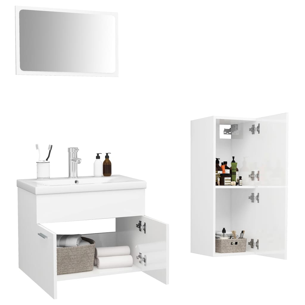 With this stylish bathroom furniture set, you can create additional storage space for your bathroom with a striking, tidy appearance. The clean lines and sleek design blend into your bathroom perfectly. The furniture set consists of a sink cabinet, a low cabinet, a built-in basin, and a mirror. The chic basin cabinet has 1 compartment, and the top of it is ideal for placing the sink. The low cabinet features 2 compartments, offering ample space to store items in your bathroom. Made of ceramic, the basin can not only serve as a vessel for daily use but also as an adornment in your living space. Thanks to its trendsetting and contemporary design, this washbasin will definitely suit any decor. An overflow is equipped to flow water out when it gets too full. The mirror also adds an excellent appearance to your home decor. Additionally, this bathroom set is easy to clean with a damp cloth. Please note: The faucet and push drainer with overflow function are included in the delivery.