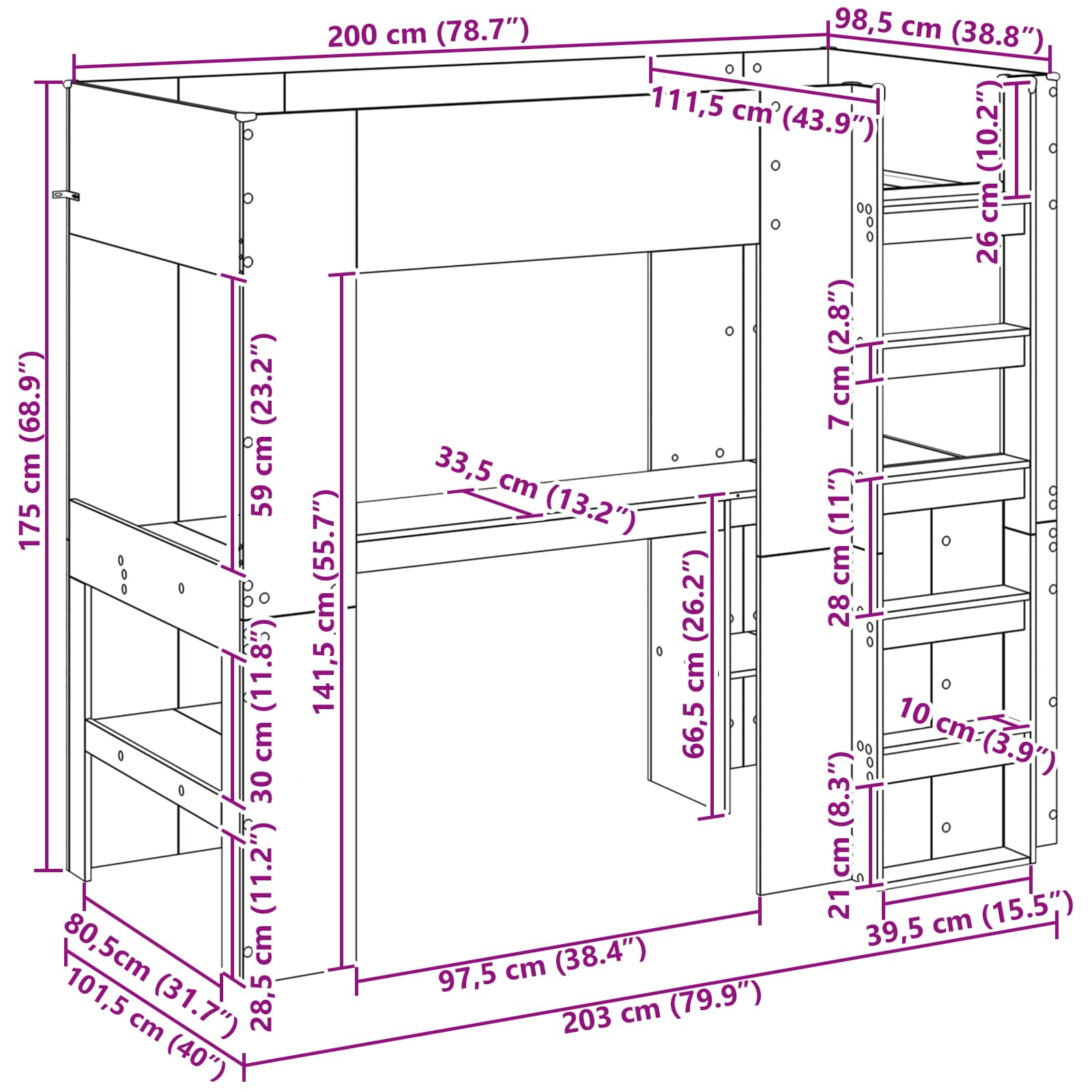 The Modern Loft Bed Frame with Desk is an ideal space-saving solution that combines functionality and contemporary style for any bedroom setting. This single bed frame offers a sleek appearance with its clean lines and minimal ornamentation. Perfect for students or small rooms, it features a desk for studying or work, seamlessly integrating sleeping and productivity zones in one compact unit. Materials: This bed frame is made from engineered wood, specifically chosen for its robust nature and smooth finish, providing both aesthetic appeal and functionality. Engineered wood contributes to the stability and strength of the frame, ensuring it meets the everyday demands of a busy household and maintains its quality throughout years of use. Included Components: Featuring a functional desk and shelves, this loft bed frame is designed to provide dedicated space for studying or work. The desk can accommodate a laptop, books, and other study materials, while the shelves offer additional storage for personal items, providing a tidy and organized area in any bedroom. Practical Design: The bed includes slats for mattress support and a safety guardrail to ensure a secure sleep environment. Its modern design, characterized by simplicity and minimalism, fits well in rooms with similar decor. The easy-climbing ladder makes access to the upper bed safe and convenient for everyday use. Recommended Uses: Ideal for small bedrooms, dorm rooms, or teen spaces where maximizing space is essential. It serves not only as a sleeping area but also as a study zone, making it suitable for students or anyone with limited space. Care &Maintenance: For optimal maintenance, it is recommended to wipe the frame with a dry cloth to remove dust. Regular checking of screws and fittings helps ensure the frame's integrity over time, contributing to the longevity of its use.