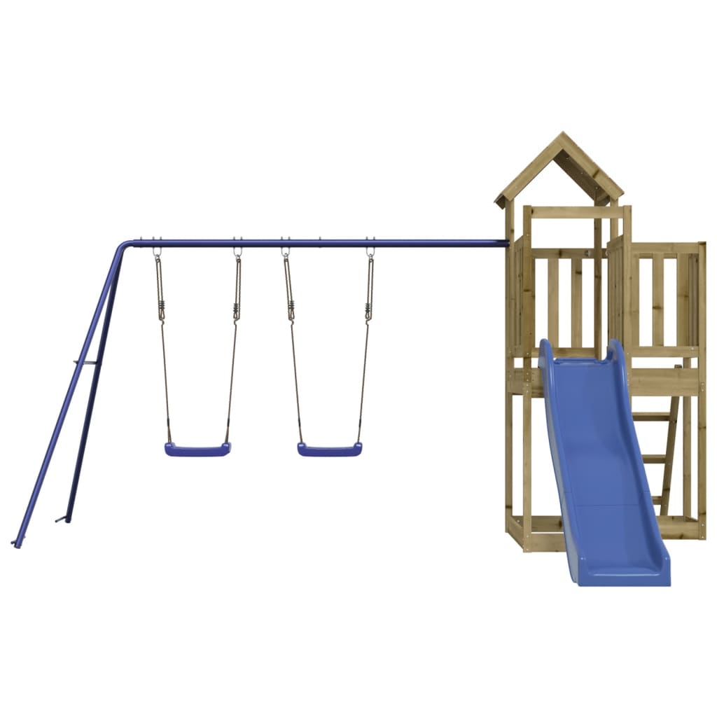 Do you want to give your children the freedom to play at home? This wooden outdoor playset transforms your backyard into a playground for imaginative adventures! Durable material: This playhouse is made of vacuum pressure impregnated pinewood. Solid pine wood is a beautiful natural material. Pine wood has a straight grain, and the knots give the material its signature, rustic look. Impregnation is a preservation process that is carried out by using autoclaves. The pressure-treatment increases resistance to decay and weather. Sturdy and stable frame: The wooden frame ensures sturdiness and stability. In addition, the "A" shaped legs of the children's swing allow for balance. Multi-activity centres: The climbing frame features a 90 cm height platform and stands out with its wave slide, a ladder, a double swing set as well as sandpits. Your little ones can also invite their friends to join the fun. Thoughtful design: The surrounding wooden railings are designed to ensure the safety of children during their happy play. Also, the wooden roof provides shade for your children on hot summer days. Endless fun: This fun-filled wooden outdoor playhouse is the perfect way for your child and their friends to enjoy entertainment, have more interactive time and make memories for you and your children! Warning:Only for domestic useOutdoor use Not suitable for children under 3 years Recommend user age: 3-8 years old Maximum per user weight: 45 kg Note:The product shall be anchored in order to reduce tipping hazards. The anchors are not included. Good to know:To make assembly as easy as possible, each product is delivered with a manual.