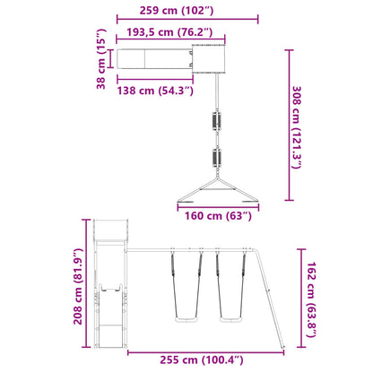 Do you want to give your children the freedom to play at home? This wooden outdoor playset transforms your backyard into a playground for imaginative adventures! Durable material: This garden playset frame is made of solid douglas wood. Douglas wood is known for its strength and durability. Its rich reddish-brown colour and unique grain patterns exude a warm and natural vibe. With good stability and resistance to weathering, it is ideal for crafting indoor and outdoor furniture.Stable wooden frame: The wooden frame of the garden playhouse ensures sturdiness and stability. In addition, the "A" shaped legs of the children's swing allow for balance.Multi-activity centres: The climbing frame features a 90 cm height platform and stands out with its wave slide, a double swing set as well as a sandpit. Your little ones can also invite their friends to join the fun.Thoughtful design: The surrounding wooden railings are designed to ensure the safety of children during their happy play. Also, the cloud roof provides shade for your children on hot summer days.Endless fun: This fun-filled wooden outdoor playset is the perfect way for your children and their friends to enjoy entertainment, have more interactive time and make memories for you and your children! Warning:Only for domestic useOutdoor useNot suitable for children under 3 yearsRecommend user age: 3-8 years oldMaximum per user weight: 45 kg Good to know:The product shall be anchored in order to reduce tipping hazards. The anchors are not included.
