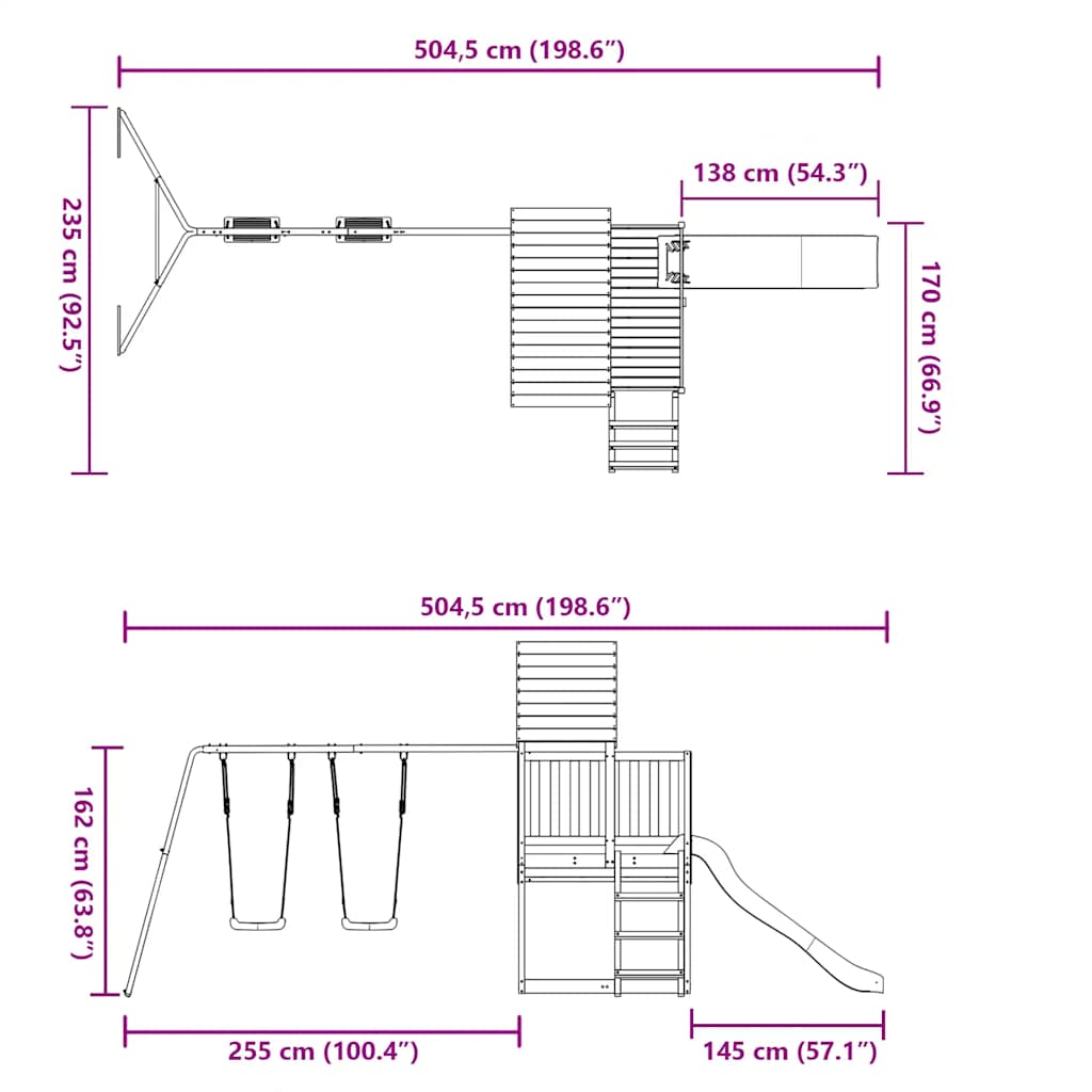 Do you want to give your children the freedom to play at home? This wooden outdoor playset transforms your backyard into a playground for imaginative adventures! Durable material: This garden climbing frame is made of solid pine wood. Solid pine wood is a beautiful natural material. Pine wood has a straight grain, and the knots give the material its signature, rustic look.Sturdy and stable frame: The wooden frame of the garden play frame ensures sturdiness and stability. In addition, the "A" shaped legs of the children's swing allow for balance.Multi-activity centres: The climbing frame features a 90 cm height platform and stands out with its wave slide, a double swing set as well as a sandpit. Your little ones can also invite their friends to join the fun.Thoughtful design: The surrounding wooden railings are designed to ensure the safety of children during their happy play. Also, the wooden roof provides shade for your children on hot summer days.Endless fun: This fun-filled wooden outdoor playhouse is the perfect way for your children and their friends to enjoy entertaining time, have more interactive time and make memories for you and your children! Warning:Only for domestic useOutdoor use Not suitable for children under 3 years Recommend user age: 3-8 years old Good to know:To make assembly as easy as possible, each product is delivered with a manual.