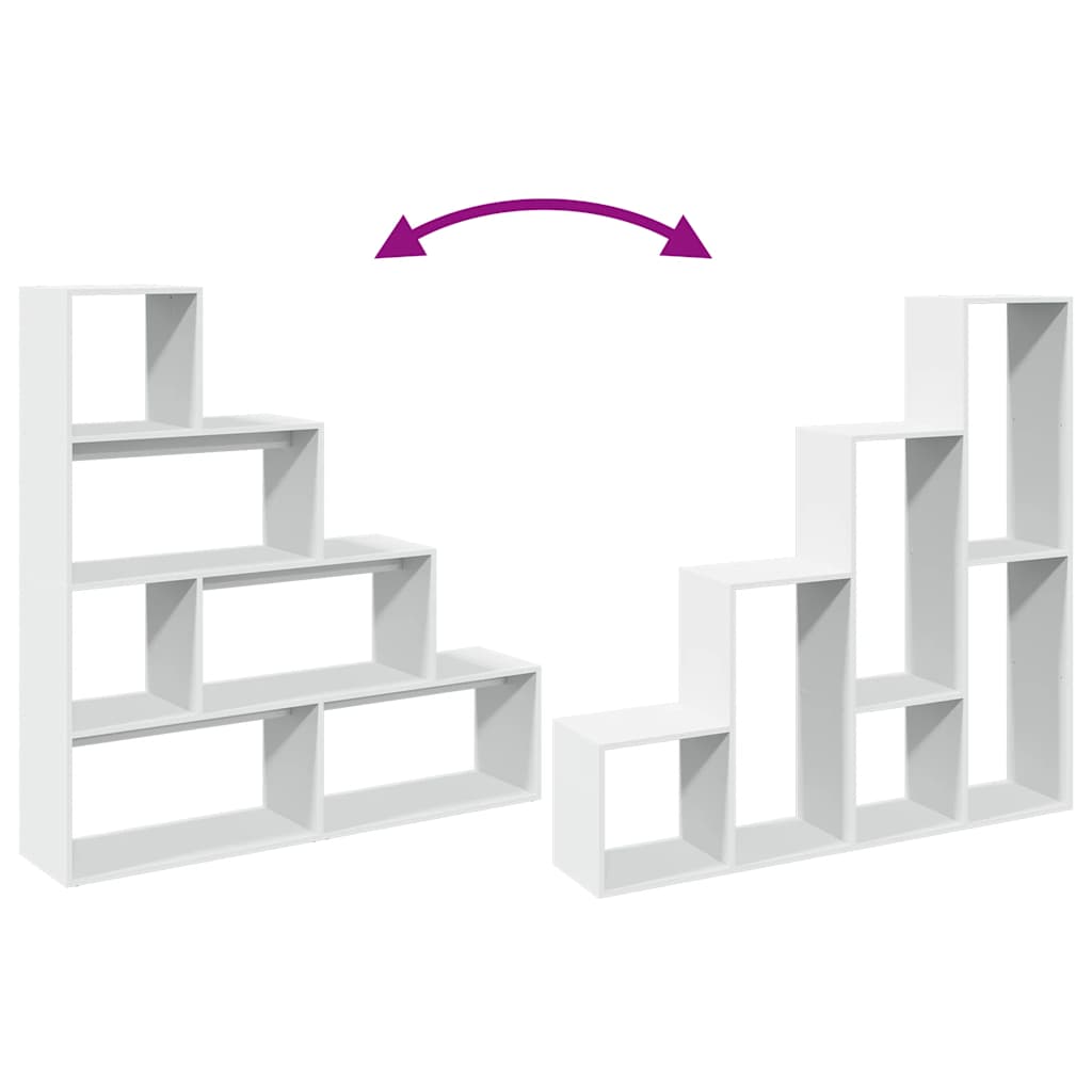 The 4-Tier room divider bookcase featuresample storage compartments, perfect for organising your space with style!Stable and durable material: Engineered wood is a durable and stable material with a smooth surface that is resistant to moisture, warping, and splitting, making it a reliable choice for various projects.Ample storage: The book shelf features storage compartments, perfect for organising books, decorations, and other household items.Flexible placement options: The shelf can be positioned with either its width or height on the ground, offering versatile room layout options.Versatile applications: The shelving unit can also be used as a room divider, easily fitting into any style of room. You can place it in the living room to display decoration, in the study to store books and documents, in the bedroom to store everyday items, and in the basement to store bits and bobs.Easy maintenance: Thanks to its smooth surface, the storage room divider bookcase is easy to clean with a damp cloth and requires less maintenance.Warning:To prevent it from tipping over, this product must be used with the provided wall attachment device.Good to know:Screws and plugs for inside the wall are not included. We advise you to find and use screws and plugs suitable specifically for your walls. If you're not sure, you can consult with a professional. Please read and follow each step of the instructions.