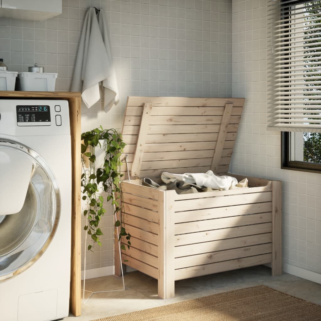 This wooden storage box is an ideal storage solution and makes a great decorative addition to your living space. Solid pine wood: This storage trunk is made of solid pine wood. Solid pine wood is a beautiful natural material. Pine wood has a straight grain, and the knots give the material its signature, rustic look.Ample storage space: This blanket box offers ample space to keep your clothing, blankets, toys, cushions and other daily essentials well-organised.Easy to open and close: You can open and close the lid easily due to the hinges.Slatted design: The slatted design allows for good ventilation of the things inside the storage chest.Untreated surface: As the storage box is crafted from solid pine wood with no finish, you can keep its natural colour but also can paint or lacquer it as per your preference.