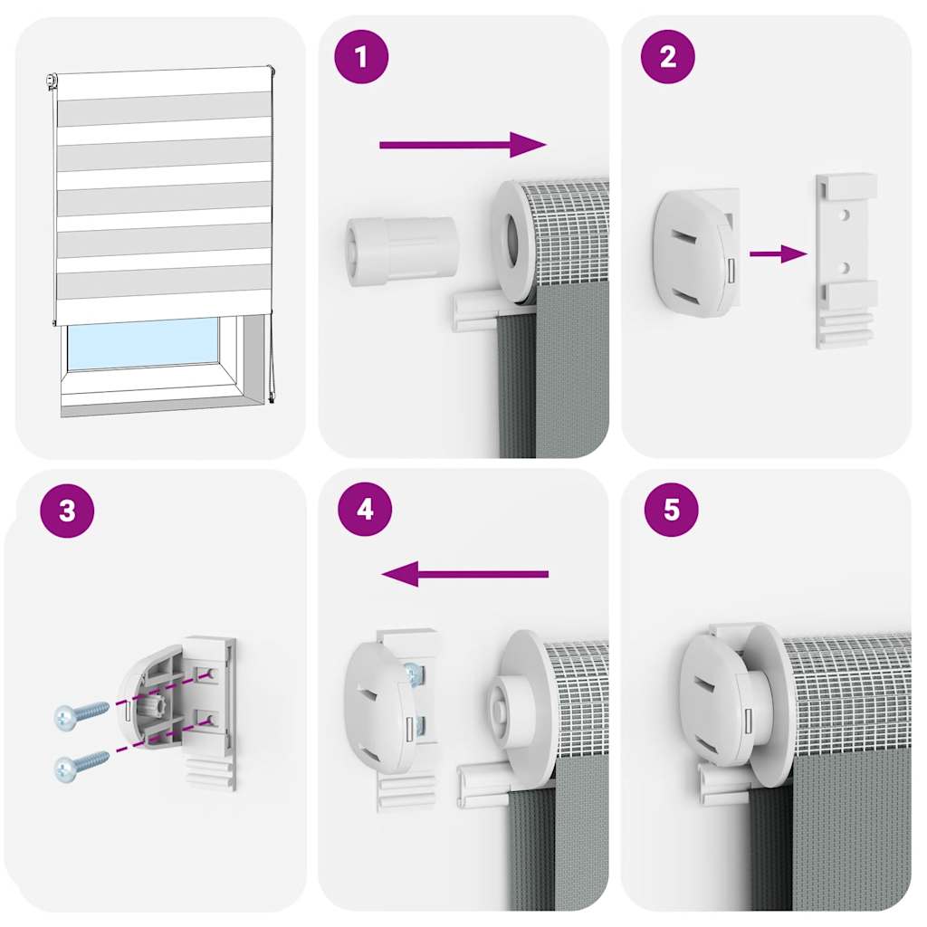 Elevate your room's style and functionality with this zebra blind, offering privacy and elegance. Durable and low maintenance: Made from 100% polyester, the zebra blind is built to last and resist wear and tear. They are also easy to clean, typically requiring light dusting or wiping with a damp cloth.Privacy and sun protection: The two-layer design features alternating transparent and opaque fabric panels. The light can be easily controlled using the chain hoist, allowing for seamless adjustment of the room's lighting from translucent to fully darkened.Two assembly ways: You can attach the zebra roller blind to the wall or window with screws or without drilling using clamping brackets, depending on your needs.Elegant design: Thanks to its sleek and modern pattern design, this zebra roller blind effortlessly complements a variety of room decor. You can use it in the living room, bedroom, office, and so on.Child safety and adjustability: The roller blind includes a chain connector that makes it easy to adjust the height according to your needs, and it also has a cord clip to add child safety. Warning:Keep cords out of the reach of young children. Cords may become wrapped around a child’s neck. Good to know:Before buying blinds, start by measuring your window glass. Just a friendly tip: the fabric is a bit narrower than the total width, including the brackets.To make sure your new blinds provide complete coverage, just add 4,1 cm to the width of the window glass when calculating what to order.